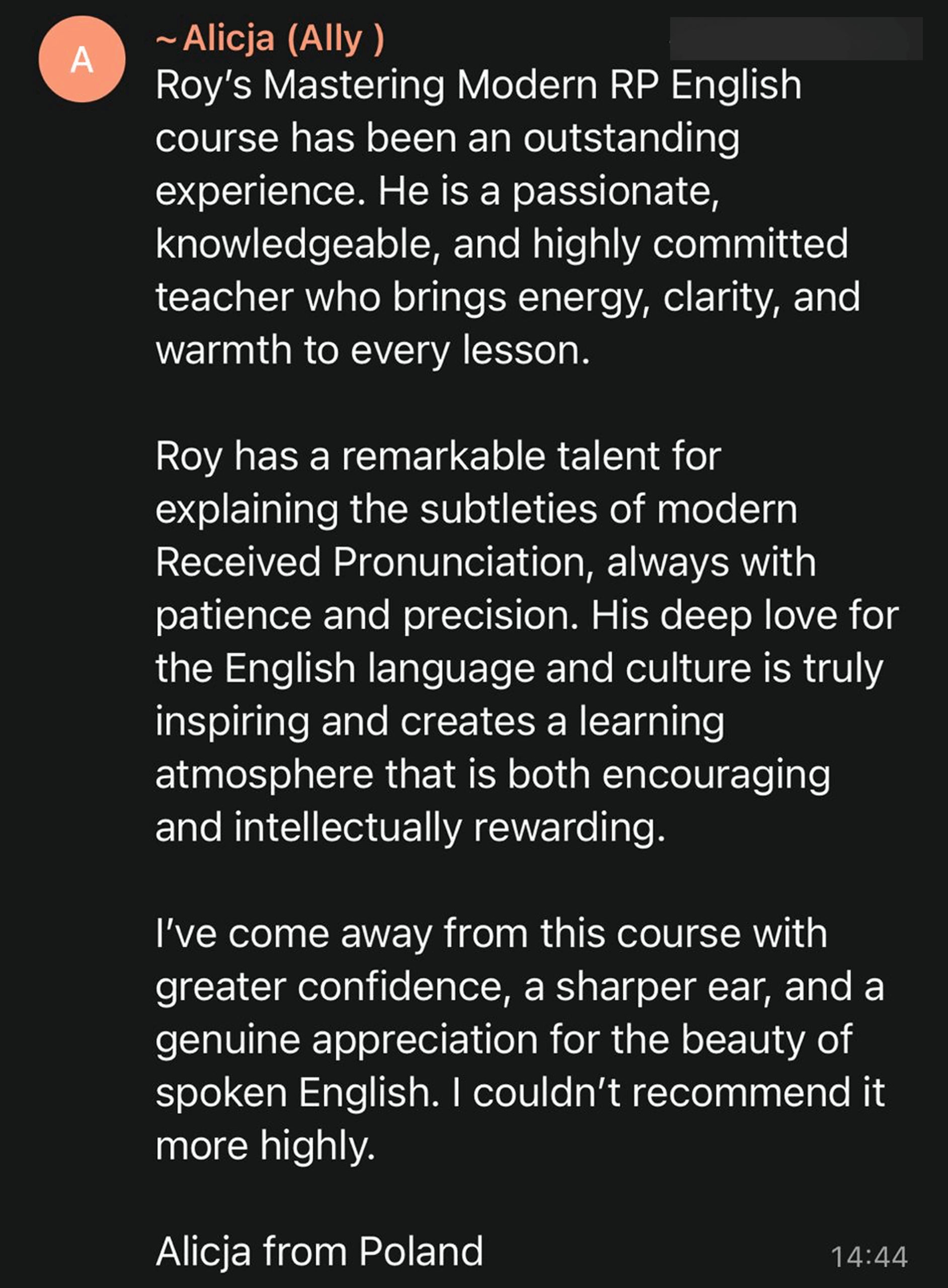 In this complete pronunciation training, Roy guides you through the Pronunciation Rewire Method – a 3-step system that teaches you how to retrain your mouth, brain, and ear to sound fluent and authentic in Modern British RP.
